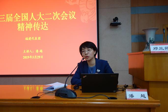 全国人大代表、我校经济学院潘越教授介绍了十三届全国人大二次会议的基本情况、政府工作报告主要内容,福建省代表团主要活动和工作,党和国家领导人在参加福建省代表团讨论审议时的讲话要点,重点传达了习近平总书记在参加福建代表团审议时的重要讲话精神,畅谈了自己参加福建代表团审议的感受体会。她说,习近平总书记在参加福建代表团审议时就营造有利于创新创业创造的良好发展环境,探索海峡两岸融合发展新路,做好革命老区、中央苏区脱贫奔小康工作等发表了重要讲话。总书记也充分肯定了近年来厦门和厦大的发展,指出厦门大学是在全国很有影响力的大学,对福建的发展和厦门的发展‘功不可没’,提供了智力支持和科技支撑。