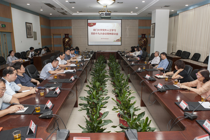 致公党厦大总支副主委、物理科学与技术学院高工朱建共,民革市委委员、管理学院副教授何燕珍,民盟厦大基层委员会委员、外文学院副教授宋佳样,民建市委副主委、厦大总支主委、环境与生态学院教授薛雄志,民进厦大总支成员、管理学院助理教授李杰,农工党厦大总支副主委、信息科学与技术学院高工王晓雪,九三学社厦大委员会副主委、信息与网络中心副主任邱仲潘,台盟厦大支部副主委陈永秀,民建市委常委、马克思主义学院教授贺东航,民革省委常委、信息科学与技术学院教授王琳十位老师先后发言。大家表示,十九大报告提出了中国特色社会主义进入新时代的重大论断,明确了习近平新时代中国特色社会主义思想,擘画了未来中国发展的宏伟蓝图,令人倍感振奋、深受鼓舞。作为参政党,厦大各民主党派将组织各自成员深入学习领会十九大精神,迅速把思想和行动统一到十九大精神上来,自觉增强维护中国共产党领导、坚持走中国特色社会主义道路的政治共识,更好地履行参政议政、民主监督、参加中国共产党领导的政治协商的职能,为我校“双一流”建设和各项事业发展贡献智慧和力量。