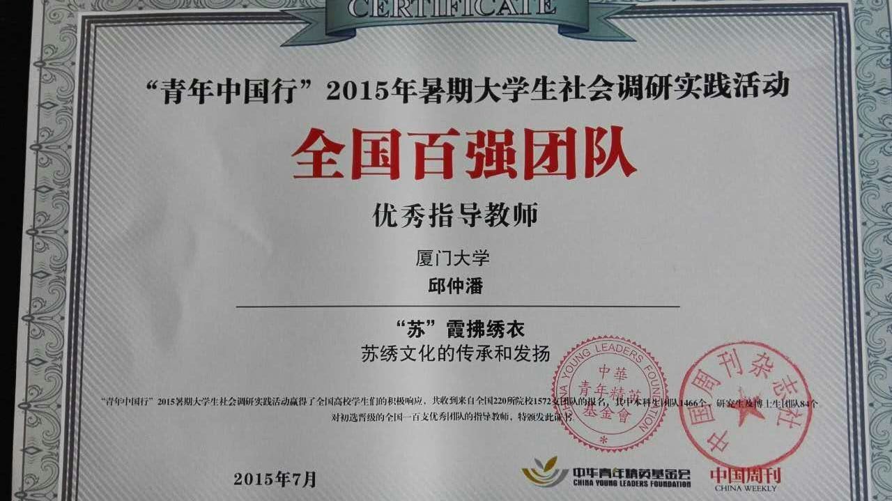 在2015“青年中国行”大学生暑期社会调研实践活动中,我校九三学社委员会副主委、信息与网络中心副主任、信息科学与技术学院邱仲潘老师获得全国百强团队优秀指导老师称号,他指导的《“苏”霞拂绣衣——苏绣文化的传承和发扬》项目,在来自全国220所院校1572个团队的1466个项目中脱颖而出,荣获百强团队称号。