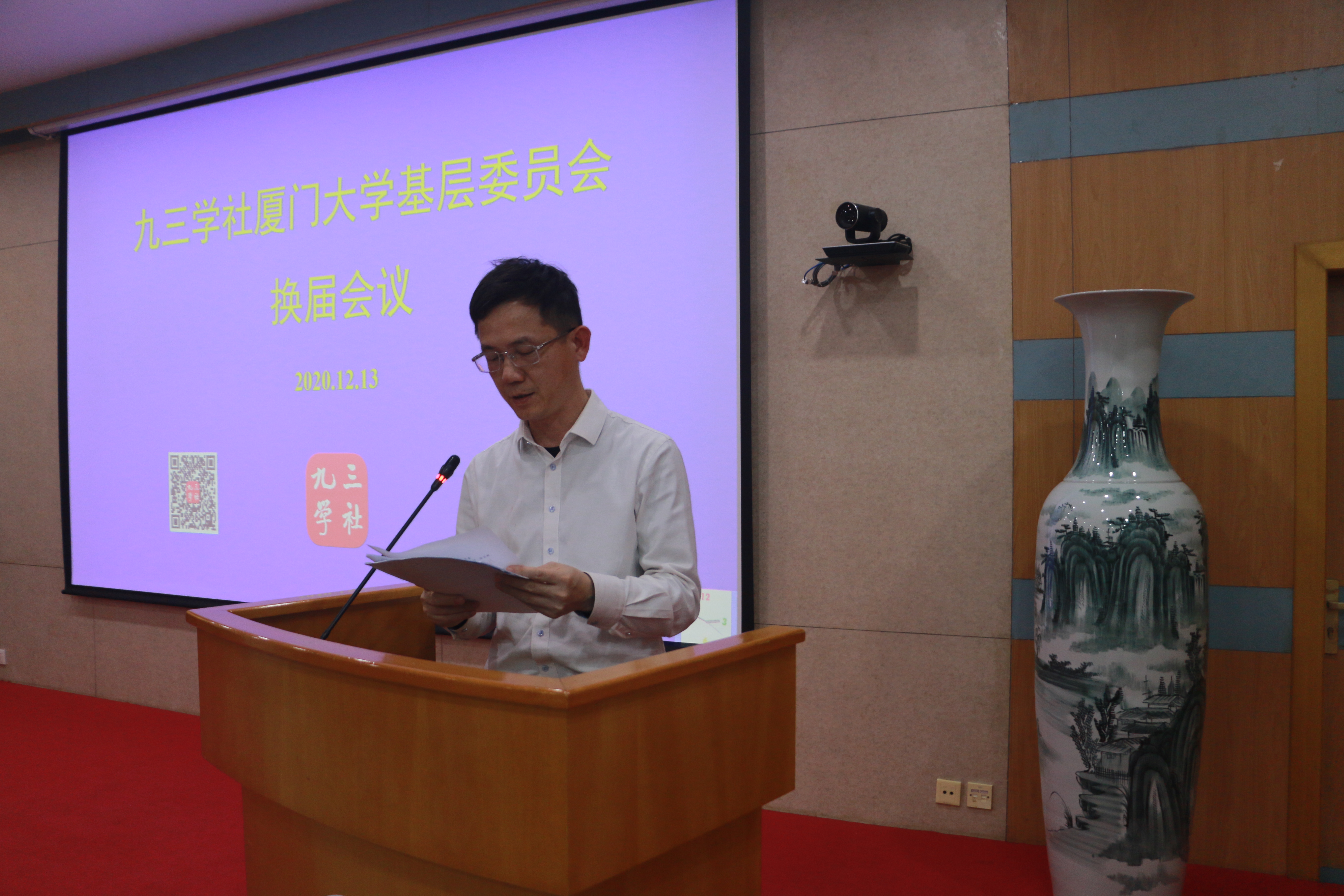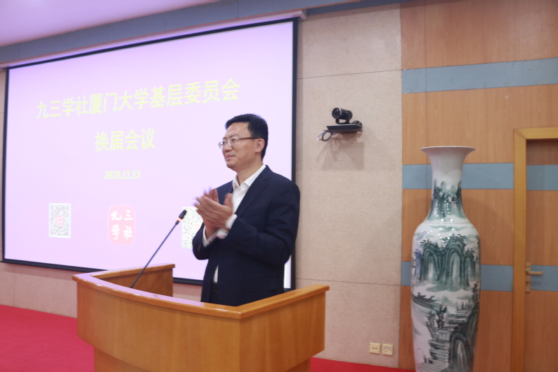 黄培强代表九三学社厦门市委致辞。他对换届大会的圆满举行和新一届委员会的顺利选举表示祝贺,对大会得到学校党委的关心和支持表示衷心感谢。他指出,今年是九三学社基层组织集中换届年,通过换届,又有一批政治素质好、工作能力强的骨干社员走上领导岗位,为基层组织注入了新的生命力,带来了新的思维。他对新一届委员会提出三点要求:一是要把学习贯彻十九届五中全会精神作为当前首要政治任务,全面深化思想政治建设,广泛凝聚共识;二是要以“十四五”规划制定和2035远景目标制定为重点,切实加强履职能力建设,展现整体作为;三是要以基层组织换届为契机,加强领导班子建设和人才队伍建设,提升基层组织战斗力。最后,他希望新一届委员会要发挥优势、提升水平、突出亮点、创新形式、拓展平台,为厦门市建设高素质高颜值现代化国际化城市,全方位推动高质量发展超越贡献更大力量。