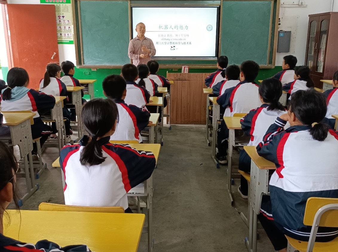 在仙夹中学,来自信息学院的张德富教授为学生做题为“机器人的魅力”的科普讲座,以常见手机程序如微信、猿辅导等为例讲解了大数据的概念、出现过程及应用范围,引出大数据应用与机器人技术的密切联系,探讨机器人技术在未来的发展方向和发展前景,同时寓德育于教学,激发了同学们的科学兴趣和学习热情。