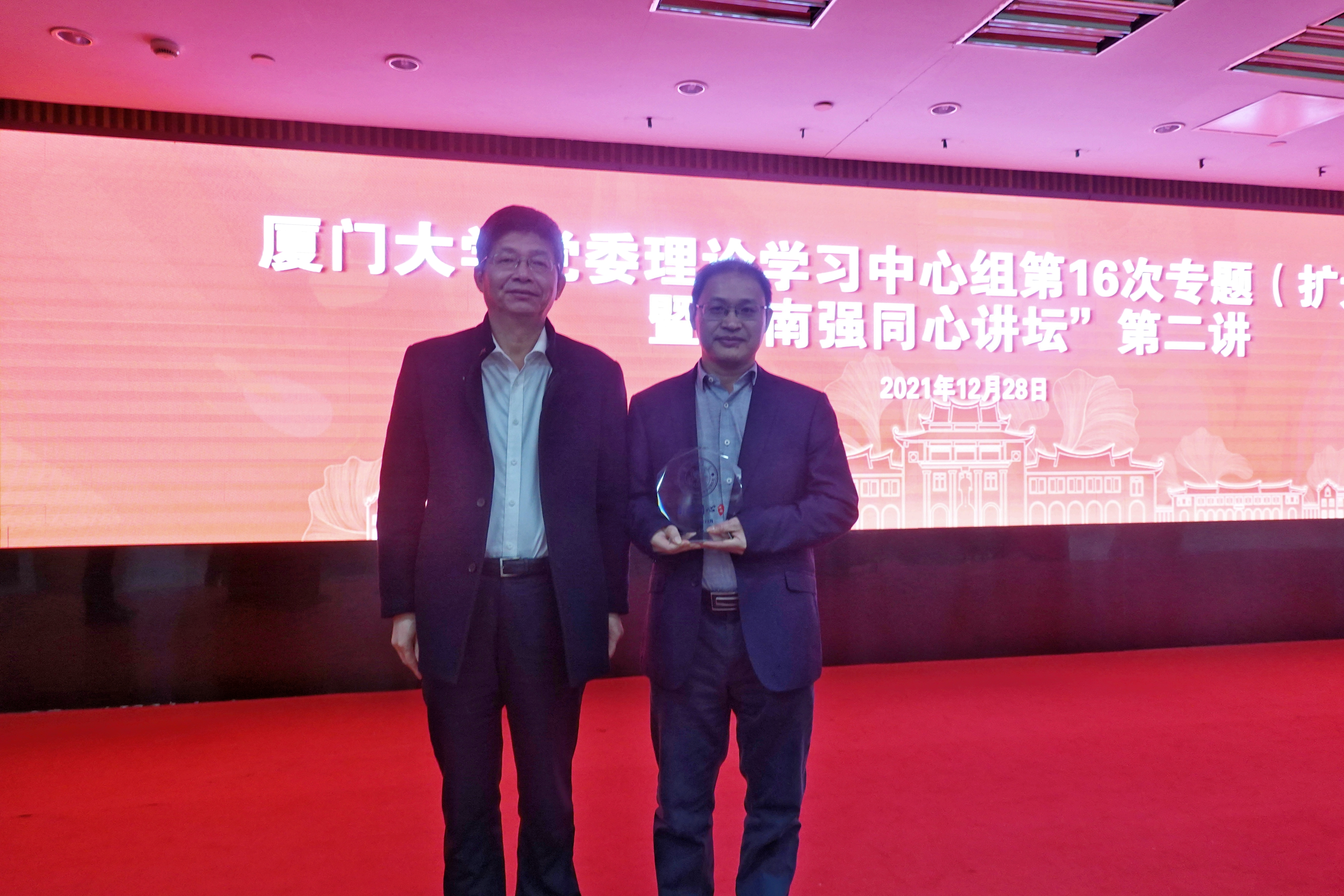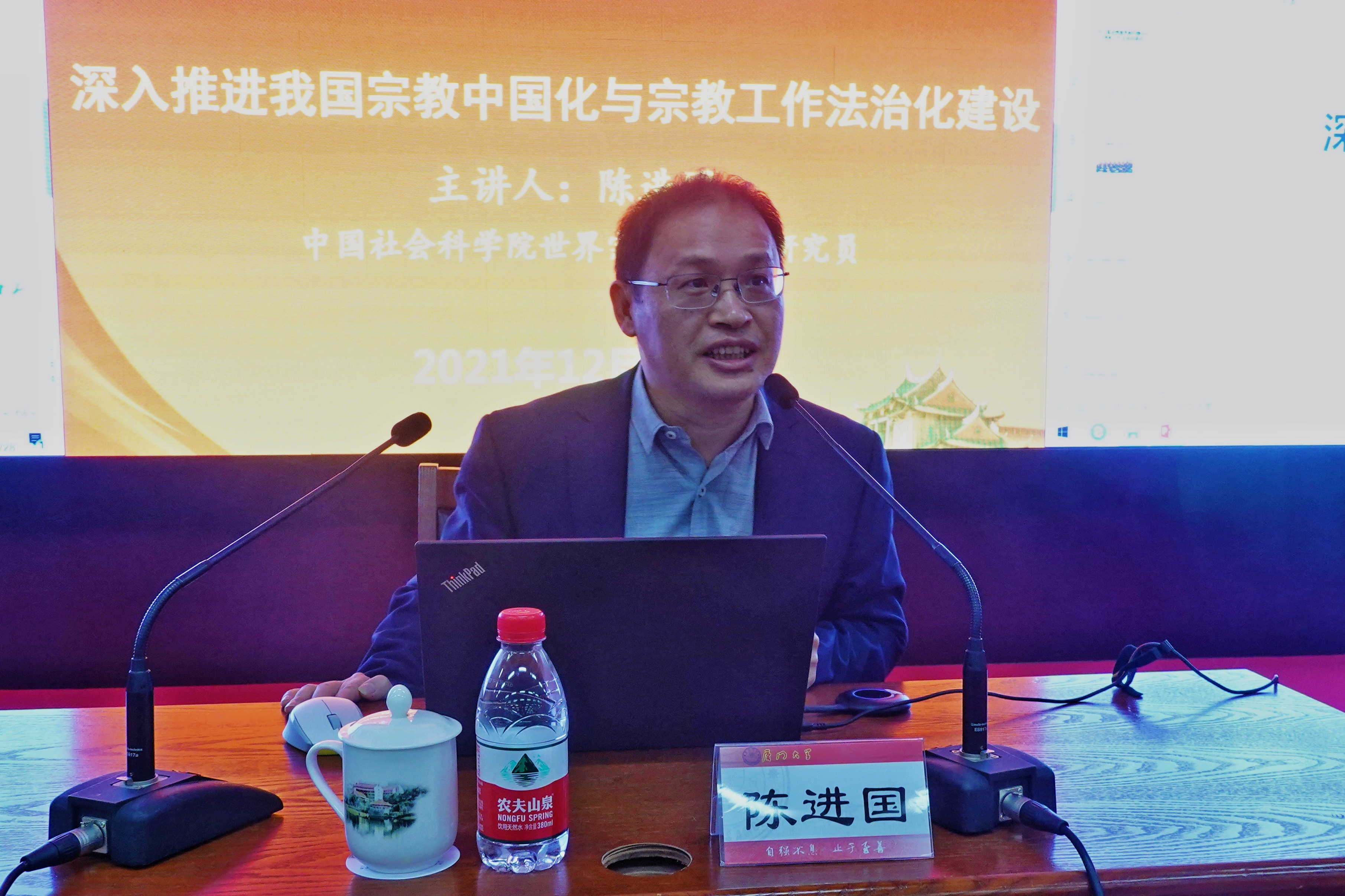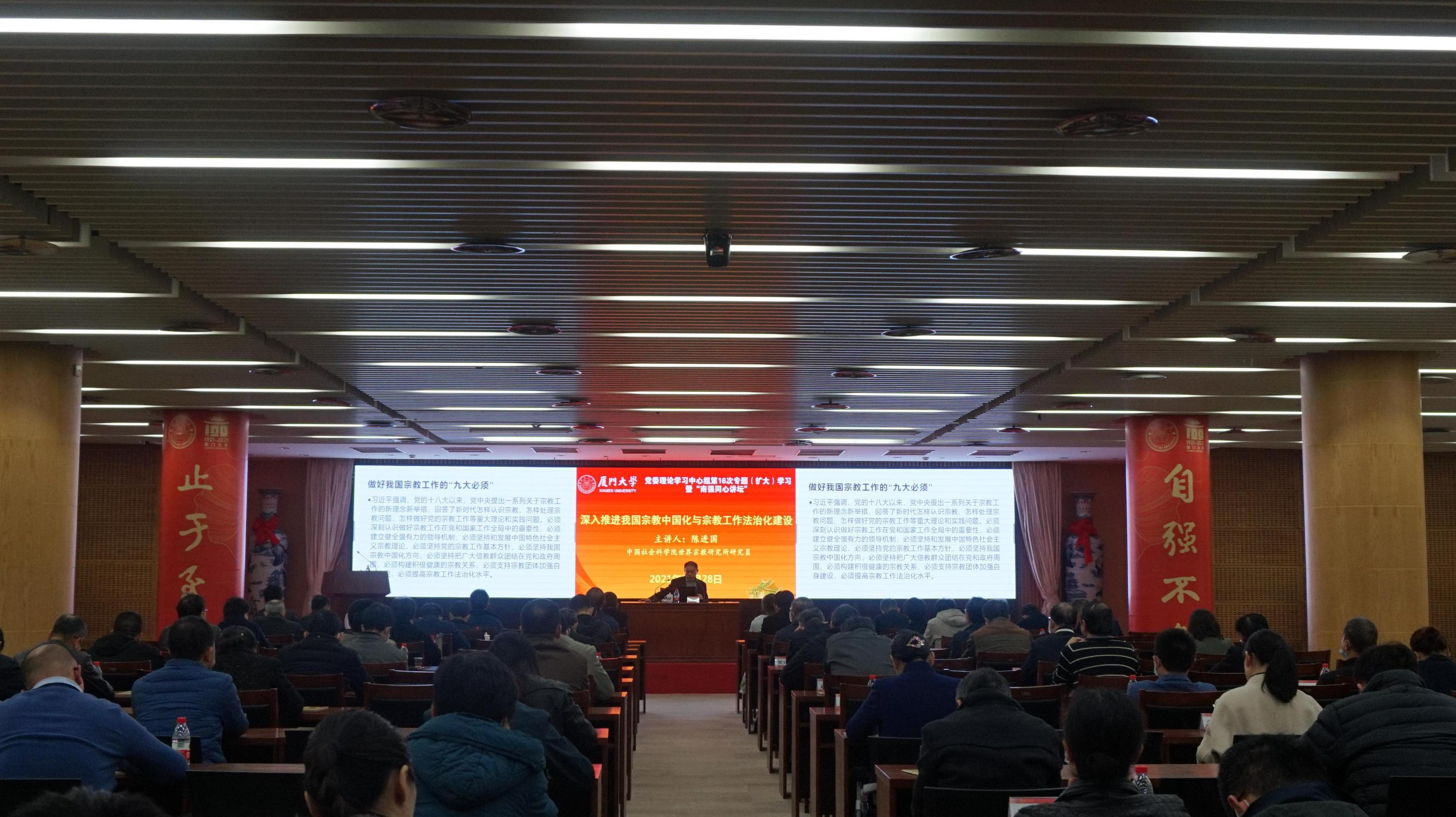 12月28日下午,校党委理论学习中心组第16次专题(扩大)学习暨“南强同心讲坛”第二讲在科艺中心举行,专题学习全国宗教工作会议精神。我校校友、中国社会科学院世界宗教研究所研究员陈进国应邀做《深入推进我国宗教中国化与宗教工作法治化建设》辅导报告。校党委副书记徐进功为陈进国颁发“南强同心讲坛”纪念牌。校党委常委、组织部部长、统战部部长孙理主持报告会。