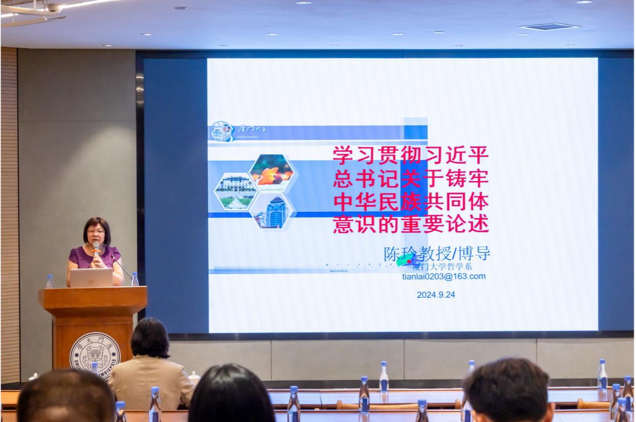 讲座现场,哲学系陈玲教授为新入职教职工作了《学习贯彻习近平总书记关于铸牢中华民族共同体意识的重要论述》专题讲座。围绕民族工作,传达了习近平总书记关于加强和改进民族工作的重要思想,以及铸牢中华民族共同体意识的主要意义和深刻内涵,并就从高校和教师如何进一步有形有感有效推动铸牢中华民族共同体意识进行了全面深刻的阐述。